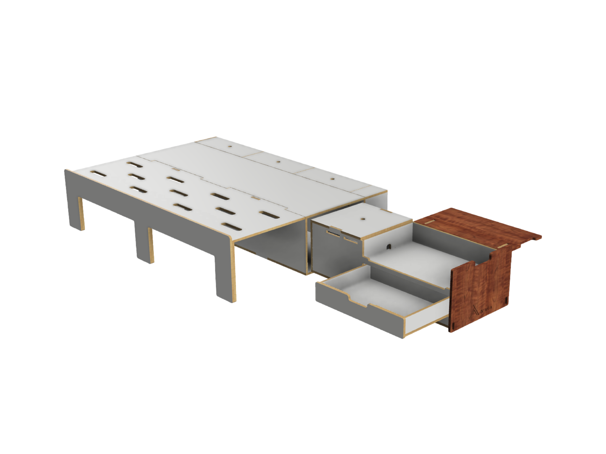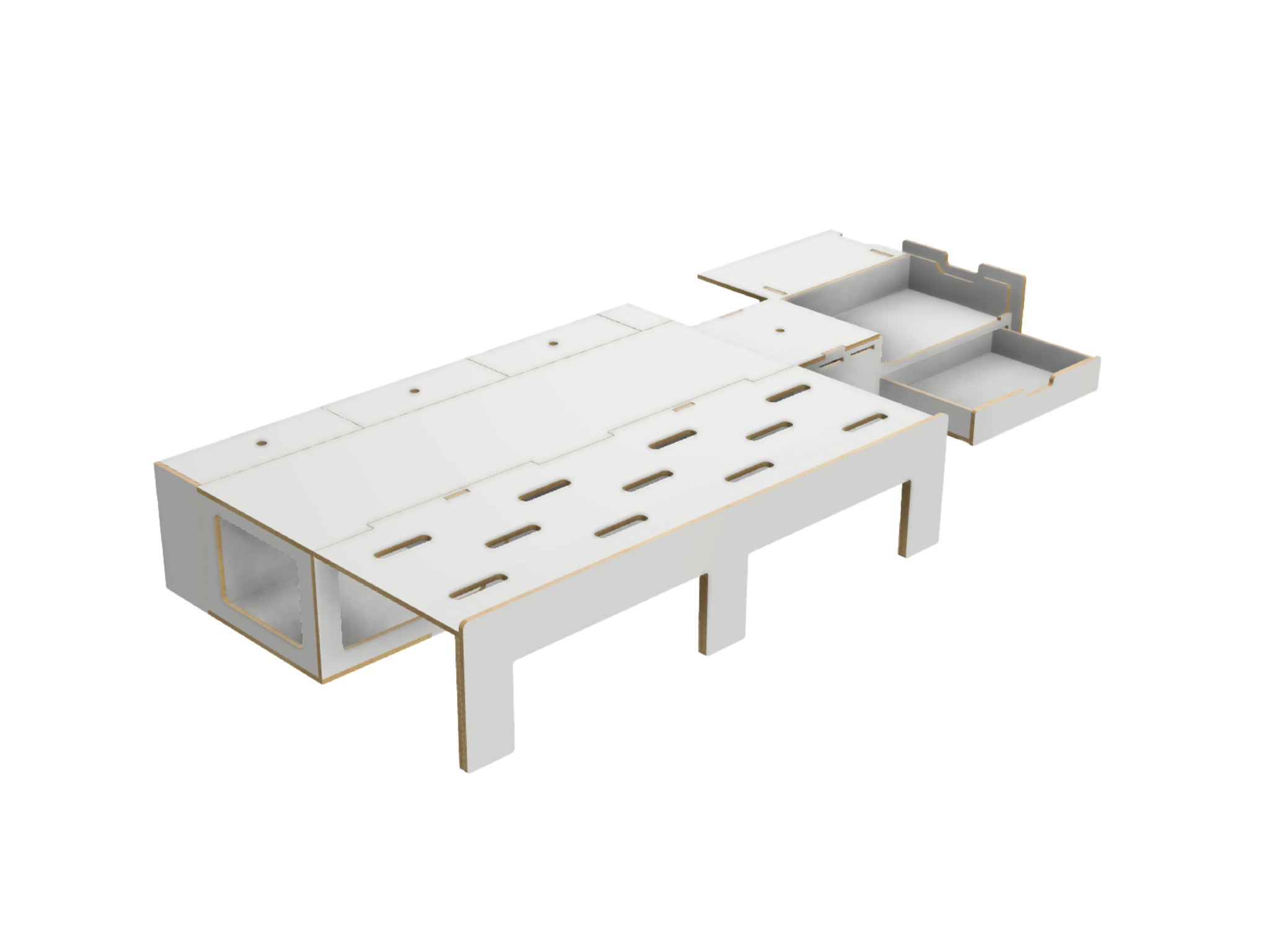 Sleeping space with expanding to a spacious double bed or sliding storage for larger items.