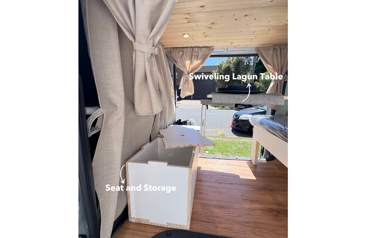 - Extra Seat & Storage with Lagun Table: This innovative table swivels a full 360 degrees, transforming your van into a versatile dining area, workspace, or relaxation zone, comfortably seating up to 4 people or a sofa for 2. Integrate with a special storage for 11L Jug or external Shower.