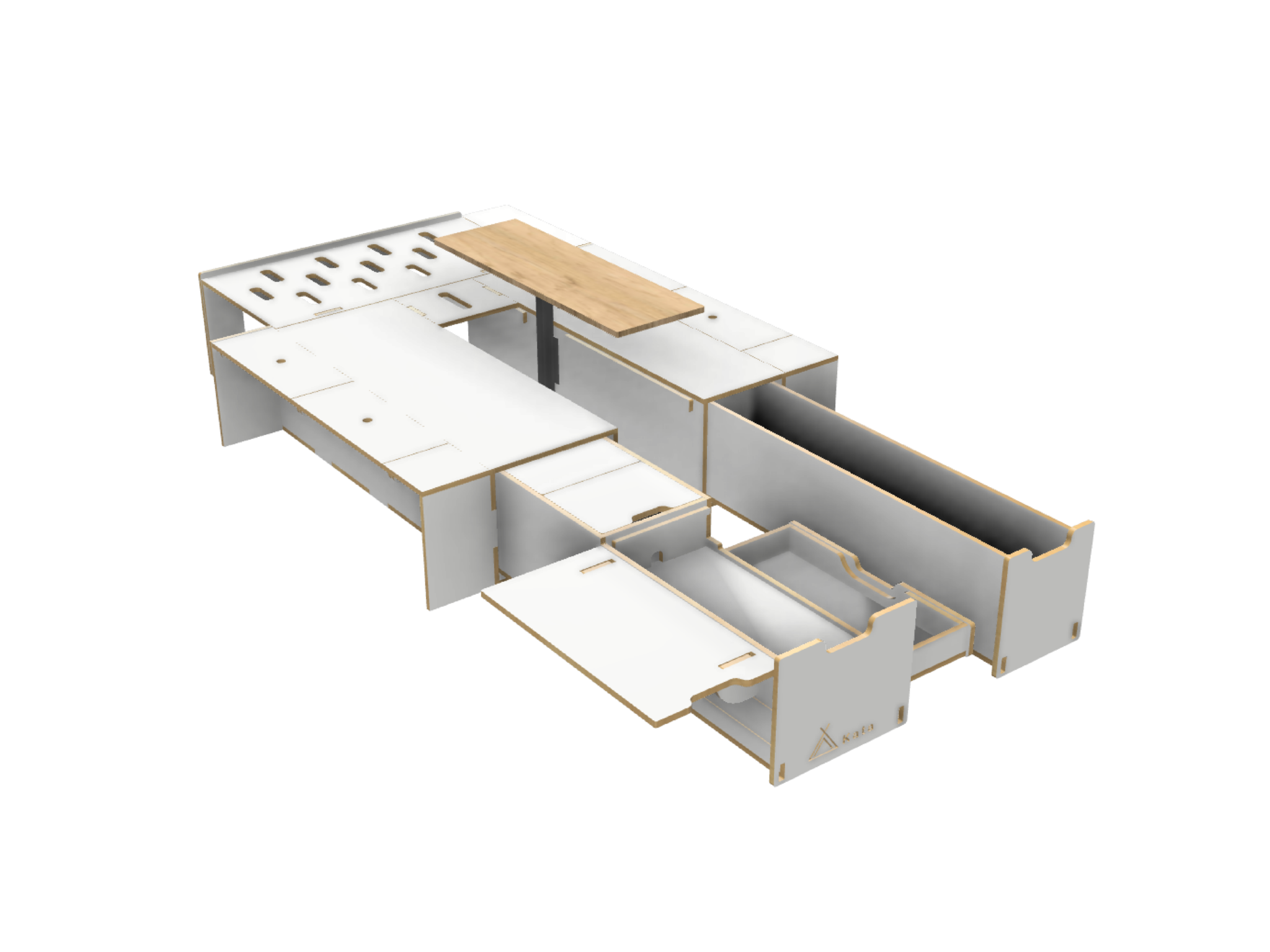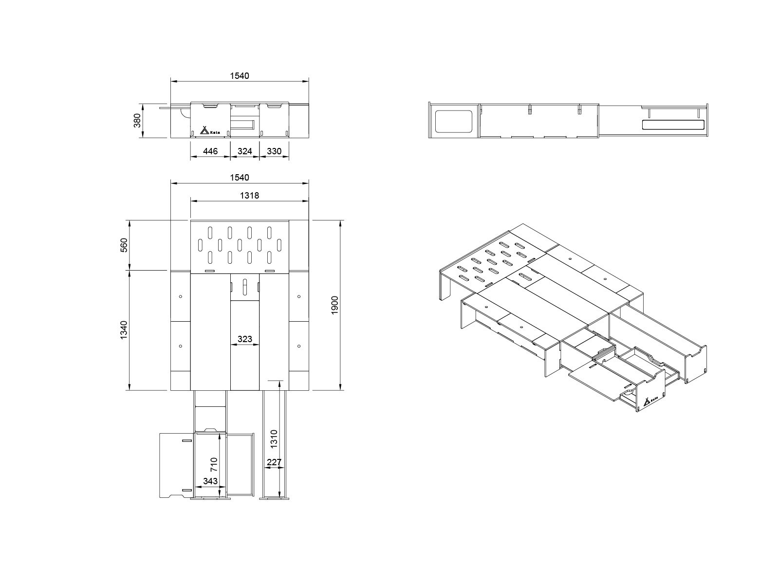 The kitchen drawer includes a cutlery drawer and a fold-out kitchen table.