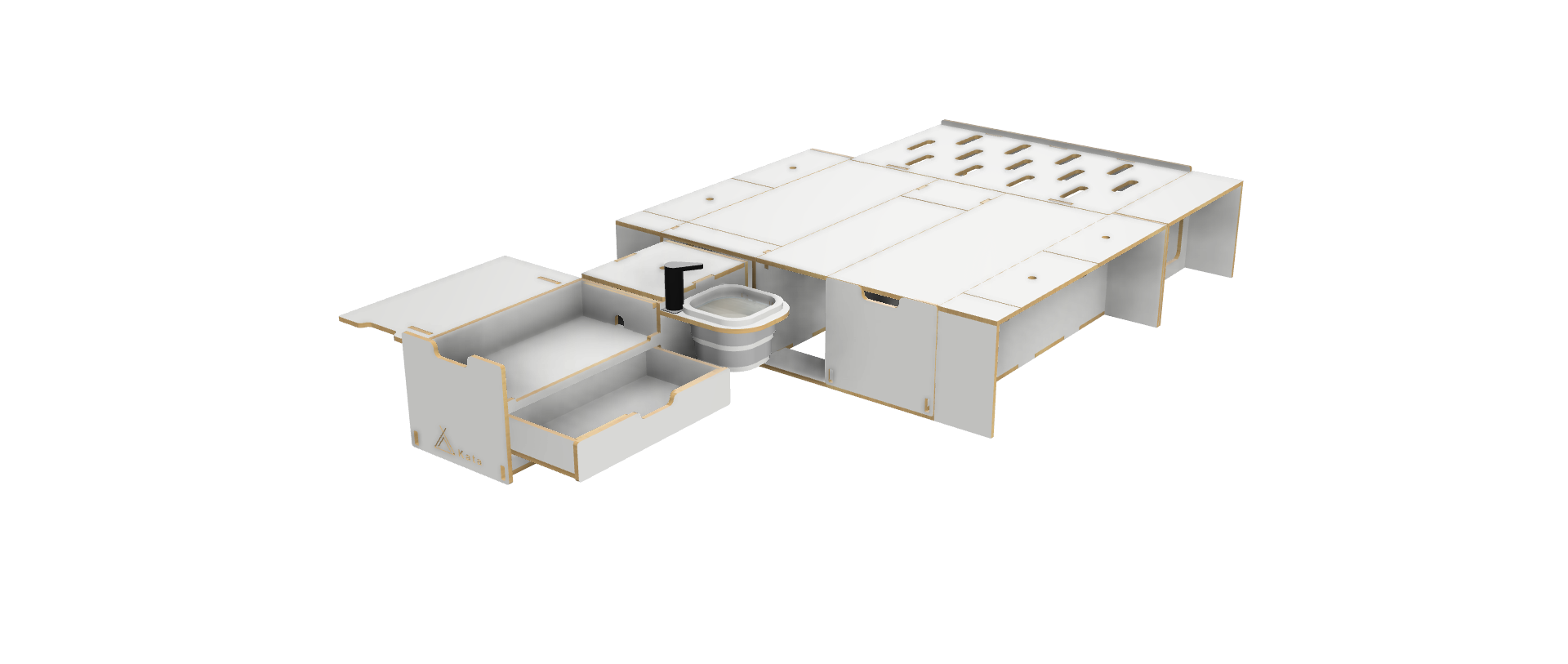 The kitchen drawer includes a cutlery drawer and a fold-out kitchen table.